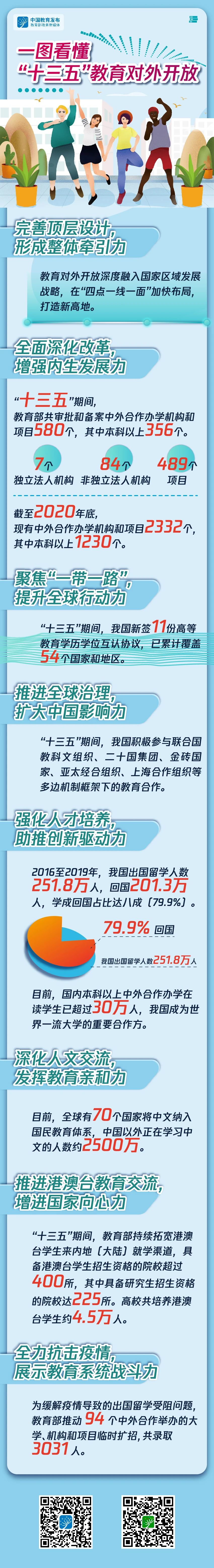 “十三五”期间,我国新签11份高等教育学历学位互认协议,已累计覆盖54个国家和地区;国内本科以上中外合作办学在读学生已超过30万人,我国成为世界一流大学的重要合作方;全球有70个国家将中文纳入国民教育体系,中国以外正在学习中文的人数约2500万......