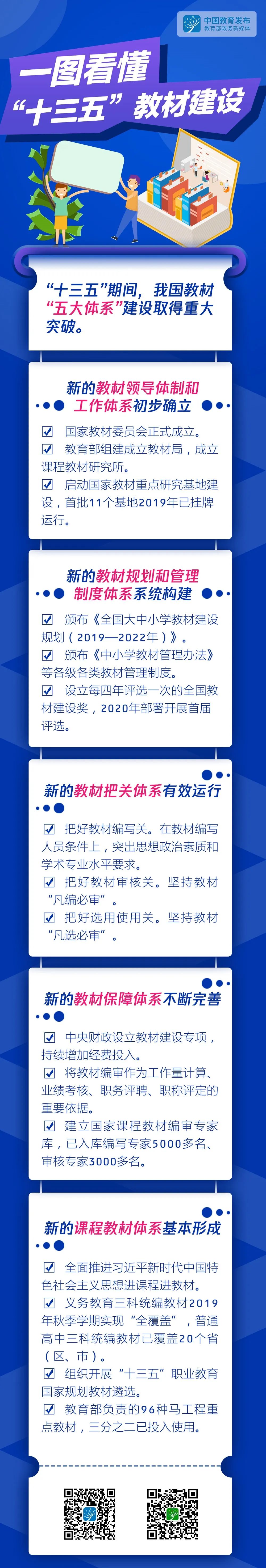 “十三五”期间,我国教材“五大体系”建设取得重大突破:国家教材委员会正式成立;教育部组建成立教材局,成立课程教材研究所;11个国家教材重点研究基地挂牌运行;部署开展首届全国教材建设奖评选;国家课程教材编审专家库已入库编写专家5000多名、审核专家3000多名;目前在用的全国各级学历教育教材已近19万种……